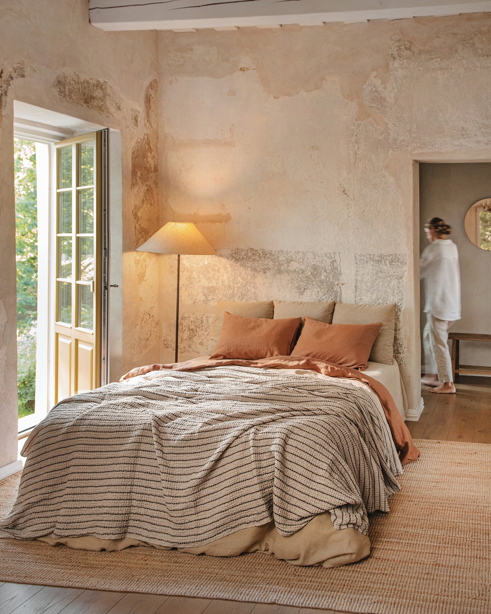 Linen-cotton blend blanket in striped pattern. Add a layer of coziness to your bed with this blanket that comes in a cozy waffle weave. Style it as a bed throw or use it as a wrap when you get cold. The natural properties of linen guarantee the feeling of comfort all year round.