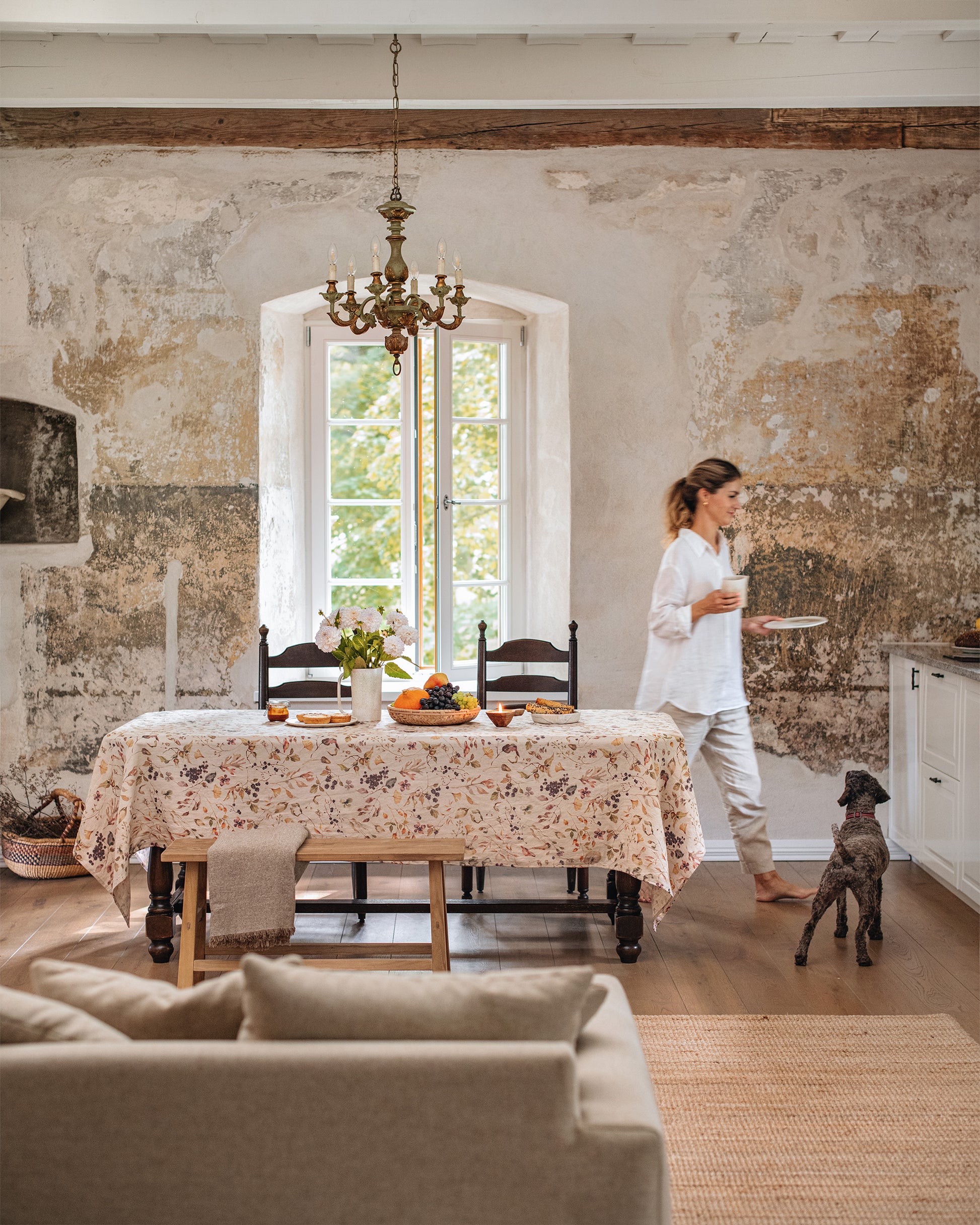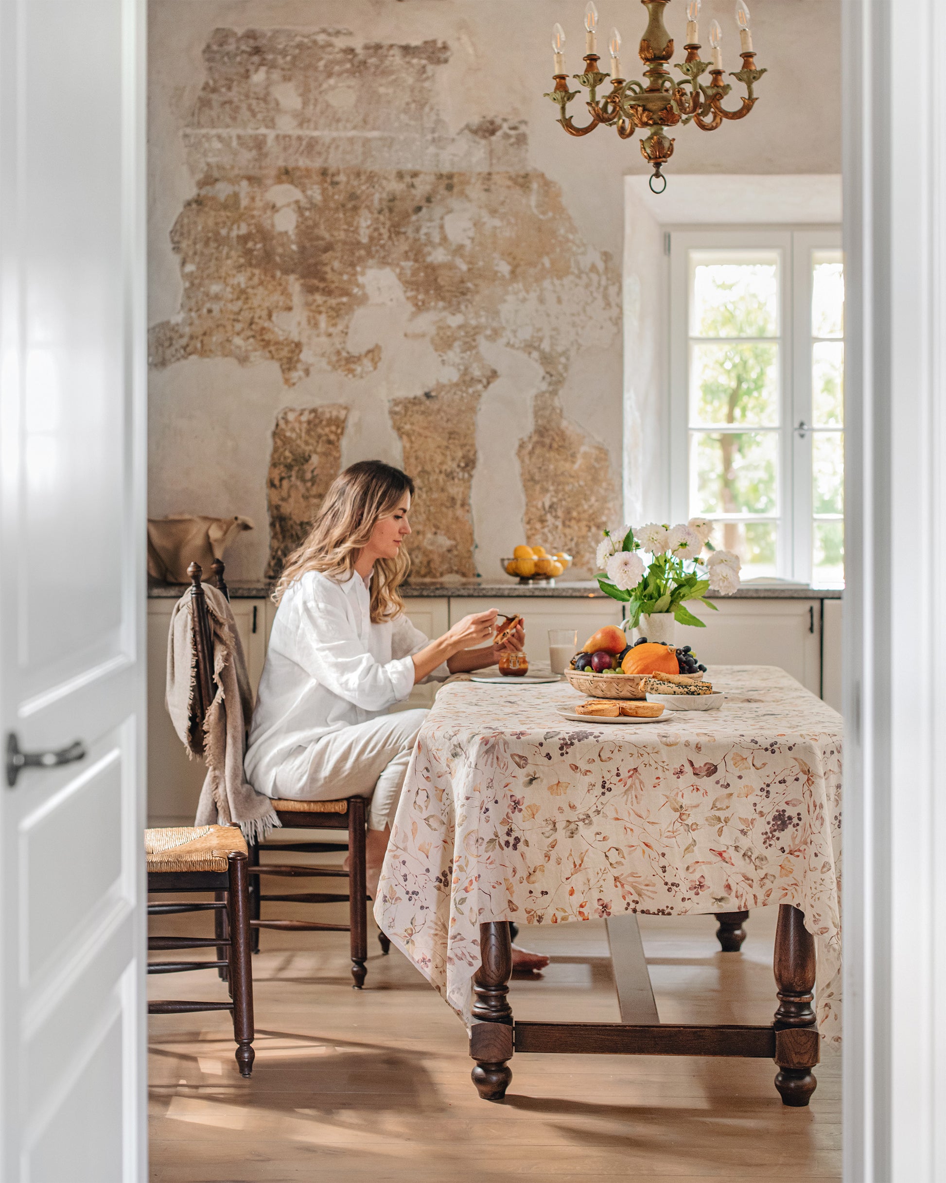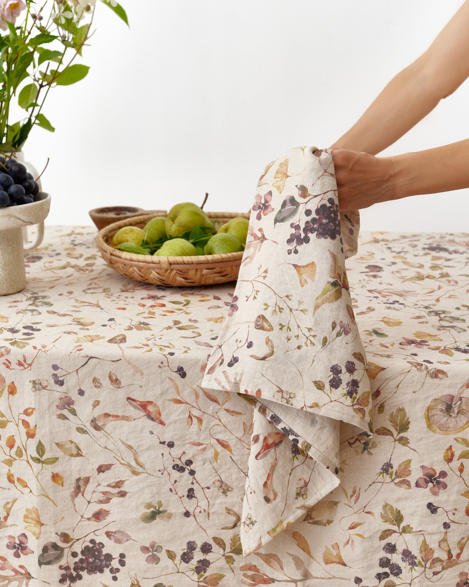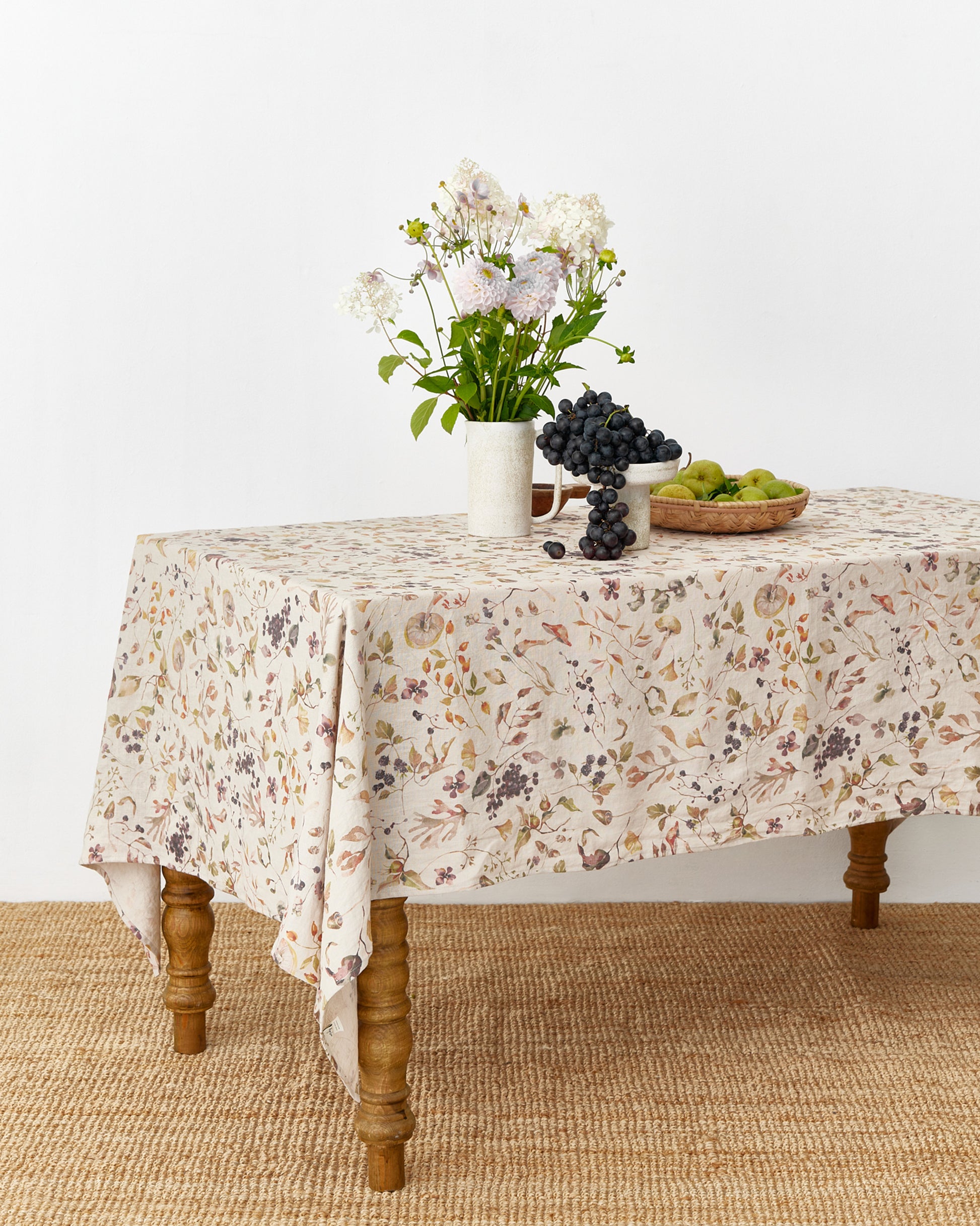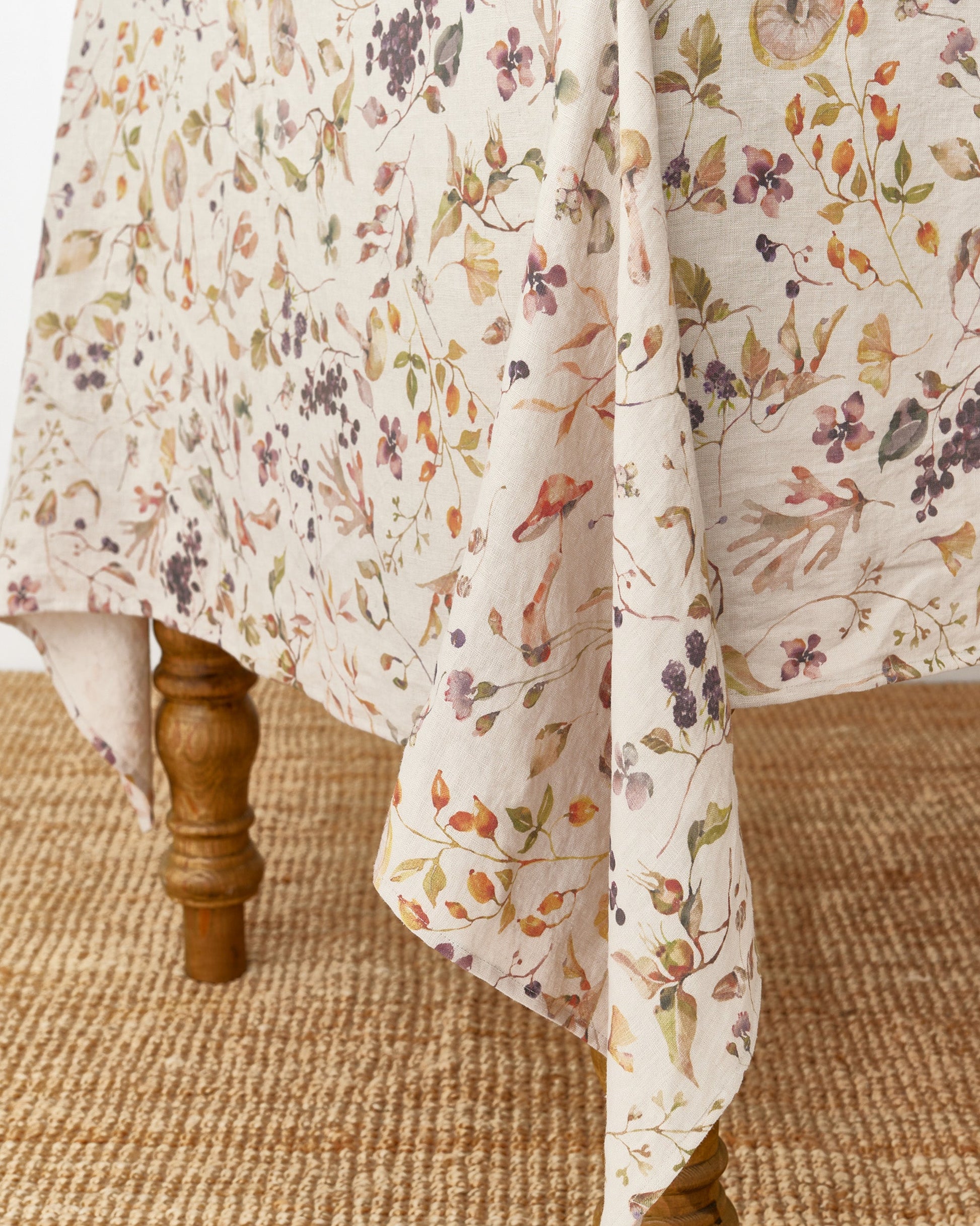 Bring the beauty of the changing seasons to your dining table with this Autumn Forest print linen tablecloth. Featuring a delicate pattern of woodland berries, branches, and leaves in soft earthy tones, it captures the warmth and charm of fall gatherings. Crafted from 100% stonewashed linen, it drapes elegantly while remaining durable for everyday use. Perfect for family dinners or special occasions, this tablecloth blends rustic style with natural elegance, making every meal feel more inviting.